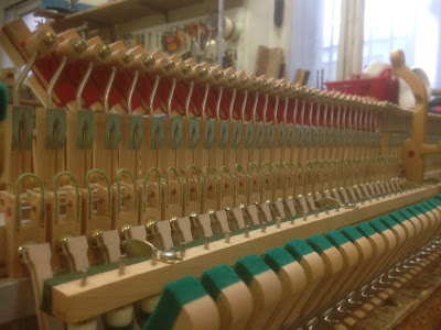 Changement des ganses des fourches de marteaux sur une mécanique de piano droit YAMAHA lu101 Travail typique d'atelier de piano ...
